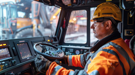 Operators navigate heavy equipment using joystick controls and a digital display. The workspace is organized with various buttons and gauges for efficient handling.