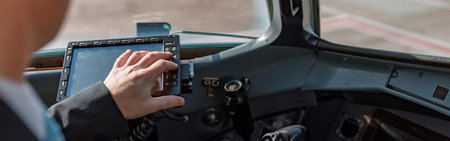 Aircraft pilot sitting in cockpit and using flight display