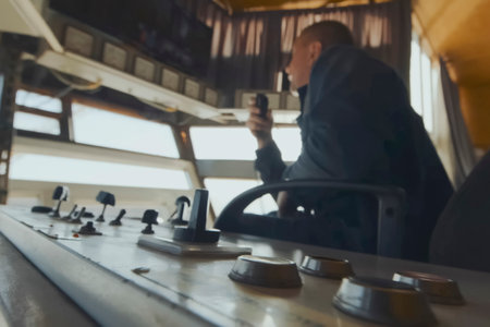 A man is at the helm of a ship, pressing a button. Concept of control and responsibility, as the man is in charge of navigating the vessel