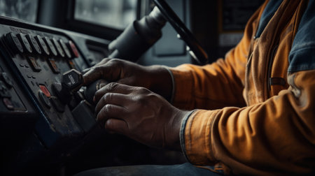 Close-up view of a driver operating heavy machinery with precision controls while on duty in an urban setting during daylight hours