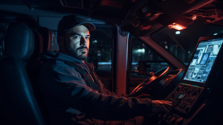 Trucker's determined expression in illuminated rig cabin