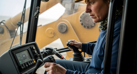 A focused woman is shown in the cab of a piece of heavy machinery, such as an excavator or front loader, skillfully operating the controls. The image highlights women in non-traditional roles and the skilled labor involved in construction and industry. It represents competence, power, and manual labor.