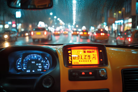 Concept of a transportation vehicle with car audio and radio panel at night with bokeh light from a rainy day
