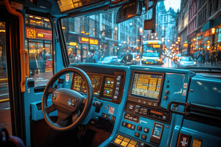 Modern Truck Dashboard and Steering Wheel With City Lights in Background, Space for Text