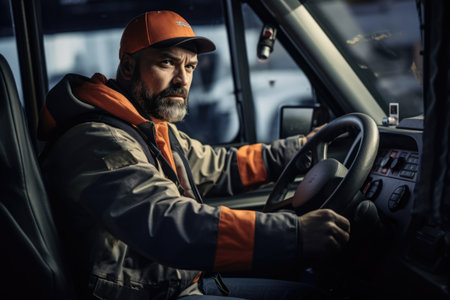 A man in an orange and gray jacket is driving a truck. This image can be used to illustrate transportation, delivery services, or a professional driver at work.