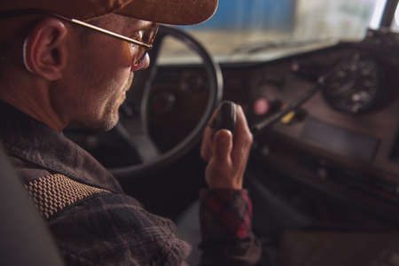 Two Way CB Radio Convoy Communication. Caucasian Trucker in His 40s Making Conversation Using Built In Truck Cabin Radio. Transportation and Communication Theme.