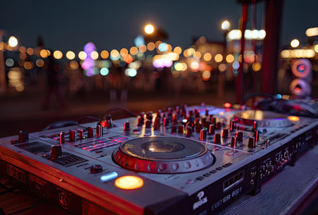 A close-up view presents a DJ mixer illuminated on a table. The equipment is detailed with numerous buttons and controls. The background reveals blurred city lights, suggesting an outdoor nighttime setting. This image is suitable for promotional materials, music-related projects, and editorial content.