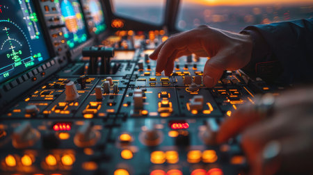 Close-up of a first officer's hand pressing buttons on an airplane control panel in a cockpit, featuring illuminated instruments at sunset.