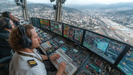 Inside an air traffic control tower, individuals monitor multiple screens displaying flight data. The scene captures the controllers in action, wearing headsets, with a panoramic view of the surrounding environment. The composition features diverse colors and details with overhead lighting. Suitable for use in various commercial and editorial contexts.