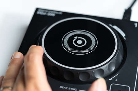 Hamd moving the DJ jocking wheel on a Digital DJ Digital controler.