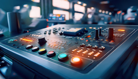 A close-up of industrial control panels with glowing buttons and switches.