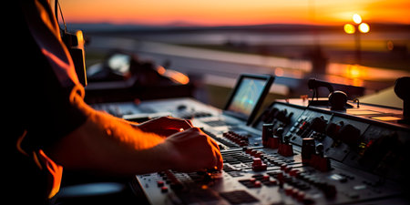 focused hands of an air traffic controller as they guide aircraft on the runway and in the sky. Generative AI