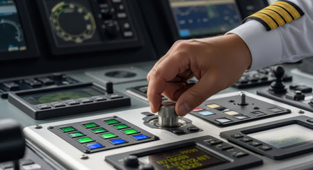 Close-up of ship captain's hand adjusting control on modern bridge console