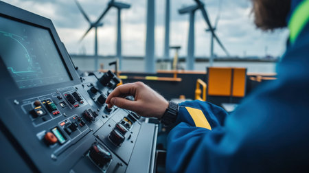 Close-up of a wind turbine engineer hands adjusting a control panel, with turbines visible in the background