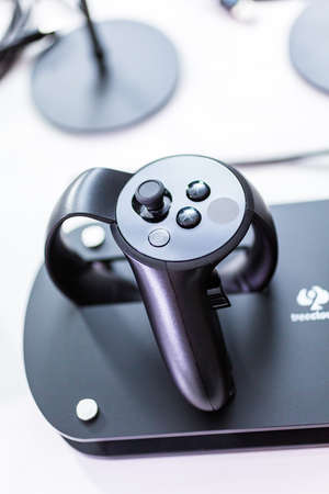 Denver, Colorado, USA-January 20, 2019 - Oculus Rift - touch virtual reality system on a white table.