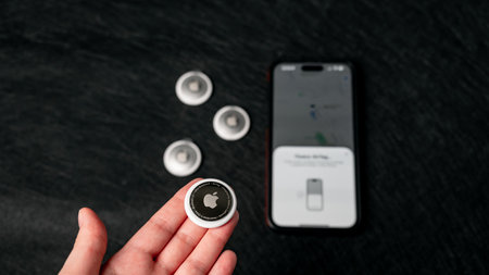Jurmala, Latvia 25.06.2024: A person is displaying a grey Apple AirTag in their hand next to iphone during the first pairing of devices.
