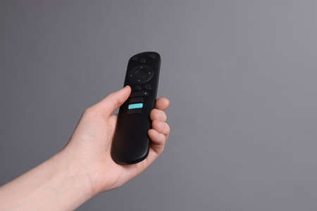 Woman holding TV remote control on gray background, closeup
