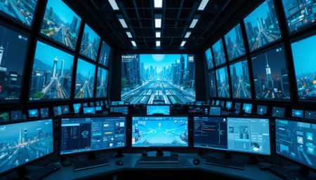 control room with a lot of monitors and cityscape in the background