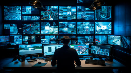 Security guard monitoring modern CCTV cameras in surveillance room