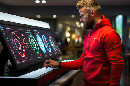 Man interacts with a smart display, controlling home automation settings. Focused expression indicates concentration on the task. High-tech interface in a modern setting.