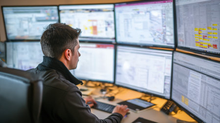 A focused operator in a modern industrial control room reviews multiple surveillance screens displaying various operational activities in a factory setup.