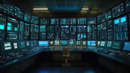 A dimly lit control room with multiple computer screens displaying data and graphs