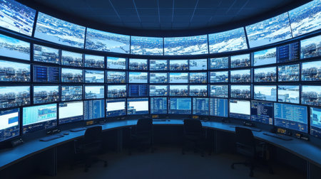 Security guard monitoring modern CCTV cameras in a surveillance room. Group of security guards sitting and monitoring.