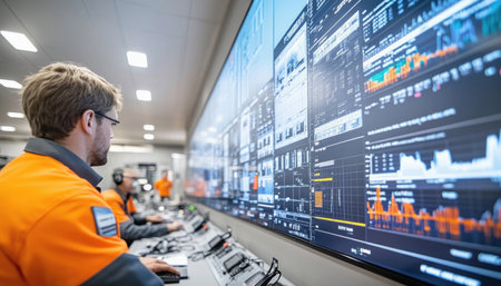 A logistics control center operates with multiple screens showing live delivery updates and route optimizations for efficiency.