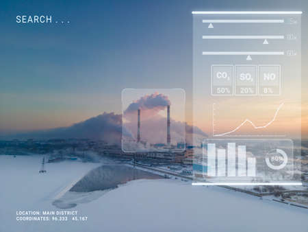 Environmental problem of pollution of environment and air in cities. Smoking industrial zone factory chimneys with digital smart display, motion design infographics