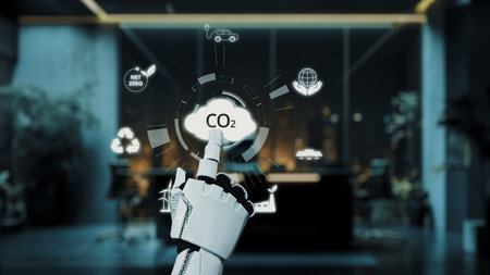A robotic hand reaches toward interactive CO2 emission reduction icons in a sleek office setting, symbolizing innovation in environmental sustainability and technology. Auvana