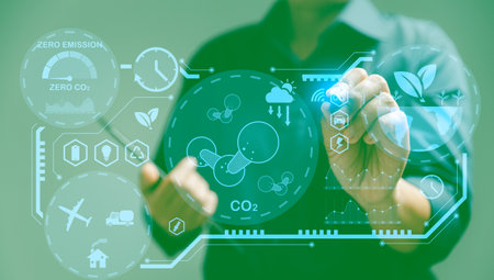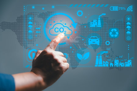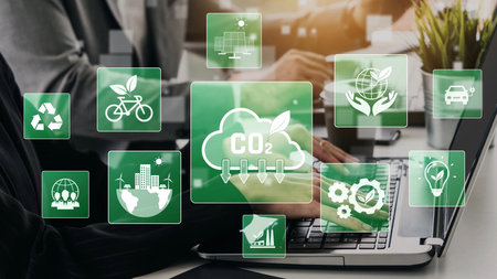 Organizations or companies develop carbon credit business virtual screen. Reduce CO2 emissions. Sustainable business development concept.