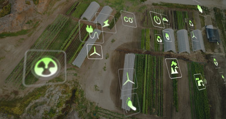 Image of eco icons and data processing over greenhouses and landscape. Global business, digital interface, finances, computing and data processing concept digitally generated image.