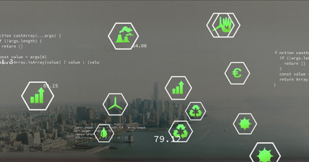 Overlaying white hexagons linking eco finance icons over river at urban harbor, with code snippets. Urban, skyline, investment, technology, environment, sustainability, connectivity