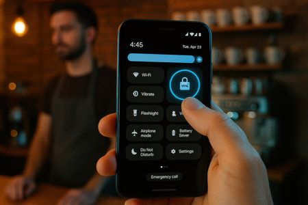 A person holds a smartphone with a VPN setting displayed while standing in a cafe. The background shows coffee cups and a barista.