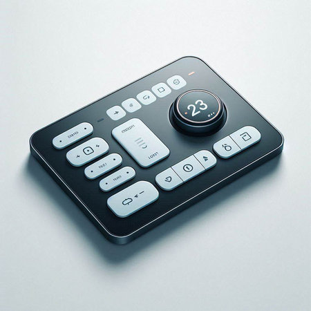 A close-up of a modern control panel with illuminated buttons, showcasing advanced audio technology in a sleek studio environment for creative professionals.