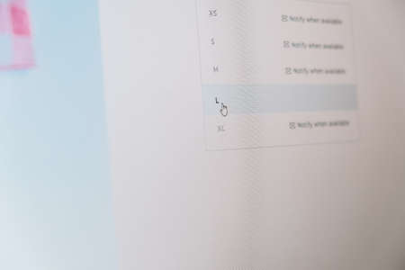 Buying goods in online store using PC. Pressing the CHOOSE SIZE to shop and pay online shopping on laptop. BUY button being pressed. Add to bag clothes. Black friday. Sale
