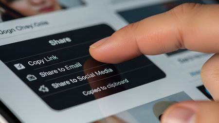 A finger presses the 'Share' button on a dark smartphone screen, revealing options like 'Copy...