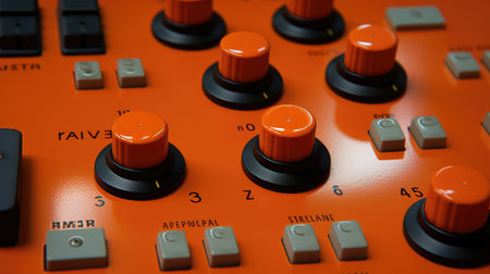 A complex control panel featuring glowing gauges and buttons in vibrant orange and blue colors set against a dark backdrop, highlighting its technological sophistication and design intricacies.