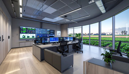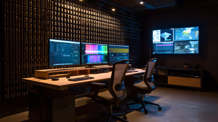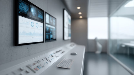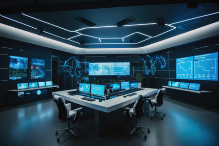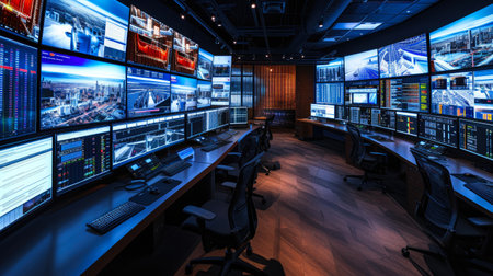 A modern control room featuring multiple high-tech screens displaying data and analytics. The sleek design emphasizes functionality and advanced technology, perfect for operations and monitoring tasks.