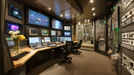 Quiet and high-tech control room with empty monitors and advanced equipment