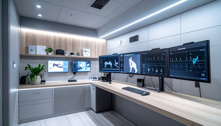 Inside a state-of-the-art command center, multiple screens display complex data streams and biomechanical analysis. This empty, futuristic workstation is the nerve center for innovation and research, poised for the next breakthrough.