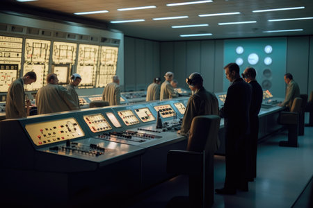 A fire control room, with engineers monitoring fire prevention systems and alarms. Generative AI