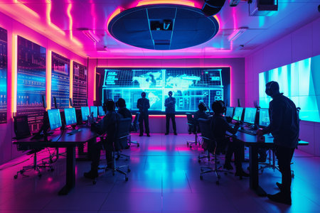 Cutting edge cyber attack simulation expert team in vibrant training room lab with neon accents