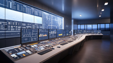 A modern control room featuring advanced monitors and sophisticated equipment, ideal for industrial management and system monitoring. The workspace emphasizes technology and innovation.