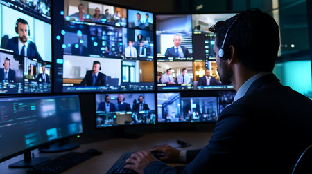 A man wearing a headset and suit sits in front of a computer screen with multiple video calls displayed. He is typing on the keyboard.