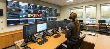 a security officer monitoring multiple CCTV feeds in a control room