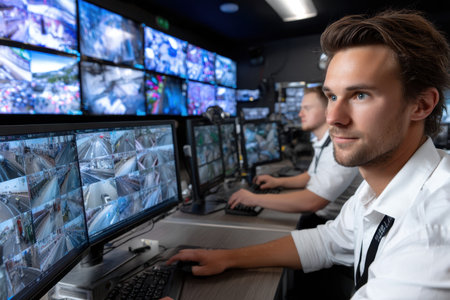 Focused security staff in surveillance control room monitoring multiple screens