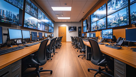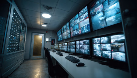 surveillance room filled with screens, each displaying different view of the building or area being monitored, created with generative ai