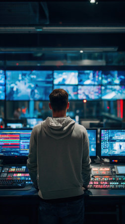 Security guard monitoring modern CCTV cameras in surveillance room of surveillance room.