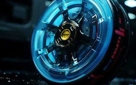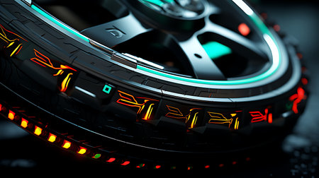 Cyber sport car wheel closeup. 3d rendering. Toned image.
